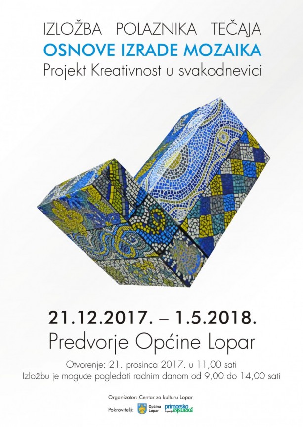 iznimno nam je zadovoljstvo pozvati Vas na otvorenje izložbe polaznika tečaja Osnove izrade mozaika koji je realiziran u okviru projekta Kreativnost u svakodnevici! Otvorenje izložbe predviđeno je u četvrtak, 21. prosinca, u 11,00 sati u predvorju Općine Lopar.